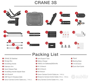 Valore commerciale 849 euro su mediaworld Praticamente quasi mai usato, perfetto , unico consiglio cambiare le batterie perche non sono originali( le avevo perse ) nuove costo 30 euro , completo di tutti gli accessori perfetto Zhiyun Crane 3S Gimbal Stabilizzatore per fotocamere DSLR Mirrorless Cinema Camcorder per Sony Canon Panasonic Nikon Camera, Blackmagic 6K 4K, Design modulare, Max Payload 6.5kg (maniglia Smartsling) Carico massimo 6,5 kg: Crane 3S è costruito con motori super nuovi che consentono un carico utile di 6,5 kg per una vasta gamma di impostazioni della fotocamera, tra cui fotocamere Canon EOS 1DX, Blackmagic Pocket Cinema e persino Canon Cinema EOS, Sony FS & FX e fotocamere cinema digitali rosse.