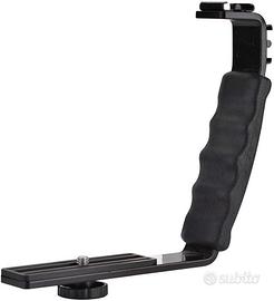 Staffa a L per fotocamera leggera e resistente, ideale per montare flash e accessori video in modo pratico.