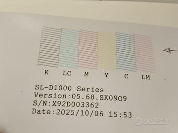 Vendo stampante Sure Lab Epson D1000 Velocità di stampa straordinaria Fino a 385 foto all'ora1 senza compromessi sulla qualità. Design compatto Ingombro ridotto, leggera e facile da trasportare. Connettività avanzata Wi-Fi, LAN e USB. Qualità elevata Tipo di inchiostri UltraChrome D6r-S e ampiospaziocolore. Appena revisionata con sostituzionepompe. Incluso nel prezzo 2 cartucce colore originali Epson, cartucce di manutenzione originale Epson, 5 scatole (10 rotoli di carta) banda 13 e 2 rotoli in uso di banda 20. Un anno e mezzo di vita, fatturabile.