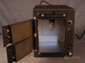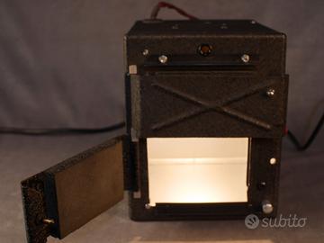 Stampatrice a contatto funzionante e in eccellente stato di conservazione per la sua età (1oo anni). Rivisto il cablaggio con l'aggiunta di un potenziometro, all'interno luce bianca e luce rossa (manca la lampada). In abbinamento il timer da un secondo a 60 minuti con visione della scala in luce inattinica. Tutto testato e funzionante. Se sei affascinato dalla (vera) fotografia ma non hai posto per la camera oscura con questo semplice apparecchio e pochissimo spazio, va bene anche lo scabuzziono delle scope. La stampatrice e due bacinelle, una lampada rossa e il gioco è fatto. Con tre secondi di esposizione stampi i tuoi negativi e buon divertimento.