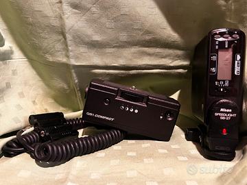 Comprende schede di memoria, teleobiettivo Tamron e Flash Canon SPEEDLITE 430 EZ + flash Nikon SPEEDLIGHT SB-27, caricatore flash QUANTUM QB1 Compact
