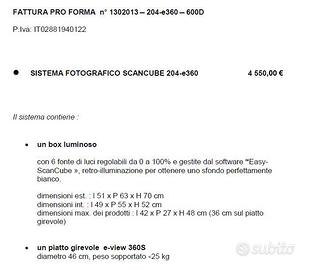 Lo ScanCube 204 è uno studio fotografico compatto “plug & play” progettato per la fotografia di prodotto (packshot) e per la creazione di immagini e animazioni a 360°. È dotato di Illuminazione integrata e diffusa per risultati uniformi, Piatto rotante motorizzato per scatti automatici e viste 360°, anche dall'alto, Controllo tramite software dedicato, semplice e intuitivo installato su computer Fujitsu (incluso). Struttura chiusa che elimina riflessi e ombre indesiderate.