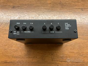 Quattro ingressi SCART supportano VHS, S-VHS, Video 8, Hi-8 e RGB. Uscite RCA per audio e video stereo, più uscite dedicate per monitor e TV. Controlli frontali per 3 canali indipendenti e modalità registrazione. Compatto, ben costruito, funzionante. Perfetto per produzioni video, digitalizzazione, streaming o progetti con formati analogici.