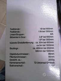Vendo, causa inutilizzo, Dörr Danubia Tamron 8/650-1300mm, Made in Giappone, Teleobiettivo T2 Per Nikon, con fissaggio a cavalletto, nuovo perfetto mai usato, custodia e confezione completa.