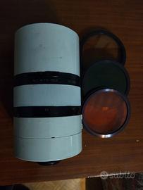 Teleobiettivo mc mto 11ca 10 1000mm, perfettamente funzionante, graffi sulla scocca dati dall'utilizzo, filtri in ottime condizioni (rosso verde, uv). La valigetta per il trasporto mostra segni di usura ma è ancora in buone condizioni.