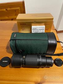 Teleobiettivo Sigma 400 f5,6 D APO AF Macro con attacco per Nikon, filtro UV 77mm, con paraluce, anello di attacco per cavalletto e tappi obiettivo anteriore e posteriore. Custodia rigida imbottita originale e manuale di istruzioni anche in italiano. Preferisco consegna a mano per valutare le ottime condizioni.