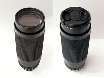 Tamron SP 70-210mm (modello 19AH) teleobiettivo macro /F3.5-32 (3.5 costante). Accessori: custodia, paraluce, filtro protettivo Kenkon MC UV, + se necessita anche l’adattatore KM per Pentax, attualmente montato sull’obiettivo. Made in Japan, top di gamma nella categoria dell’epoca. Molto apprezzato ancora oggi ed utilizzato su fotocamere digitali per la qualità dei colori, la morbidezza nonché la nitidezza (sia nel distante che nel macro), la robustezza, la praticità della messa a fuoco/zoom con il solo barilotto (la messa a fuoco resta invariata zoomando). Unico proprietario, usato poco, in perfette condizioni, conservato in luogo asciutto. • innesto: Adaptall-2 compatibile con molte marche (con adattatore PKA a contatti elettrici, il diaframma è gestito in A-automatico) • rapporto ingrandimento macro 1:2,66 / minima distanza messa a fuoco 0,85 m • paraluce a baionetta • lente frontale Ø 62 mm (tappo superiore non originale, non ostruisce il barilotto)