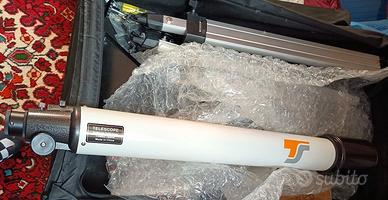 Telescopio a Rifrattore, usato pochissimo e perfetto, marchiato TS, diametro 90mm focale da 910, senza segni, righe o abrasioni, calibrato e allineato, completo di tutto (Cavalletto, contrappeso, regolatore a cremagliera, cercatore, borsa, paraluce....) Caratteristiche principali: Apertura 90 mm, Lunghezza focale 910 mm, nessun falso colore, Deflettori interni, tirante montato su cuscinetti semplici, regolazione tramite pignone e cremagliera, Protezione anticondensa. Cercatore. SOLO RITIRO A MANO. Formula visto e piaciuto. Posso consegnare io sino a 15 Km con aggiunta di 15€ con pagamento della consegna anticipata. 150€