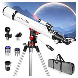 Vendo Telescopio Astronomico Hetekan70700. Ha una lunghezza focale di 700 mm e un'apertura di 70 mm. Il telescopio è dotato di oculari intercambiabili (10 mm e 25 mm), di una lente di 3X, in più in regalo una lente 5X, con treppiede regolabile, borsa per il trasporto, adattatore per telefono. Usato pochissimo nessun segno di usura tutti i componenti nella confezione originale. Vendo causa inutilizzo. A disposizione per info ed altre foto.