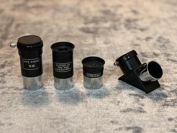 Completo di borsa per il trasporto, treppiede estensibile, ripiano porta accessori, oculari 25 e 10 mm, lente di barlow 2x, diagonale a specchio 90 gradi, mirino puntatore a punto rosso, telecomando Synscan, pacco batterie, cavo per aggiornamento da pc, cd e manuali.