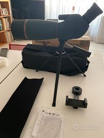 Telescopio per ornitologia, sport all’aperto,caccia, tiro con l’arco,molto luminoso. Fornito con treppiede, sostegno per cellulare e pezzetta per pulizia. Nuovo mai usato.