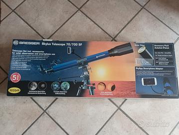 Telescopio Bresser SKYLUX 70/700 con adattatore per smarthpone e montatura EQ-AZ per l'osservazione di oggetti celesti come la luna, i pianeti o le costellazioni. Include un filtro solare per l'osservazione del sole.
