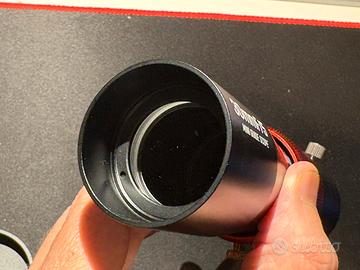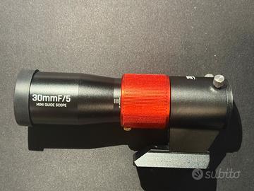 Mini telescopio guida ZWO 30F5, in condizioni pari al nuovo, lunghezza focale 150mm sistema ottico APO aggiornato con vetro ED. Apertura 30mm f/5 peso 348g, ideale per telescopi principali fino a 750mm di focale. Messa a fuoco precisa e con vite di blocco. Filettatura M42 mascio per avvitarci direttamente le fotocamere con filetto M42, e morsetto in ottone per utizzare le camere guida con naso da 1,25”.