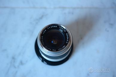 Obiettivo topcon re auto 28mm 2.8 in ottime condizioni e perfettamente funzionante. Raro obiettivo progettato per le topcon re super (super d), super dm e gli altri modelli reflex con sistema automatico per il diaframma. L' obiettivo è in ottime condizioni estetiche e funzionali; ha lenti pulite, diaframma pulito e messa a fuoco morbida e ben frizionata. Venduto senza tappi. Valuto la vendita in blocco insieme ad un corpo Re super funzionante sui tempi ma non nell'esposimetro. Disponibile la spedizione. Non esitate a contattarmi per ulteriori informazioni.
