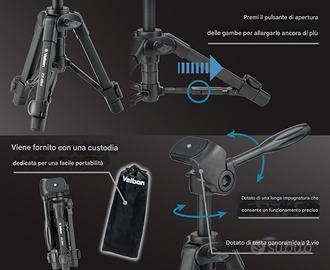 Velbon EX-Mini è un treppiede in alluminio ultra compatto e leggero per lavorare da tavolo e Macro con una gamma di fotocamere digitali e videocamere compatte. Viene fornito completo di pan a 2 vie e testa di inclinazione che consente una vasta scelta di composizione. Completamente esteso, utilizzando la colonna centrale scorrevole, il treppiede può raggiungere un'altezza massima di lavoro di 41,7 cm. Una volta ripiegato, misura solo 25,5 cm di lunghezza. Le bretelle radiali per gambe conferiscono al treppiede la massima rigidità e stabilità e possono essere estese per dare un'altezza di lavoro estremamente robusta di soli 19 cm. Le gambe a 2 sezioni sono dotate di piedini in gomma che aderiscono bene alla maggior parte delle superfici. La EX-Macro supporta un carico di 1,5 kg e il diametro della sezione superiore della gamba è di 17 mm. Include anche una custodia per il trasporto. Usato pochissimo.