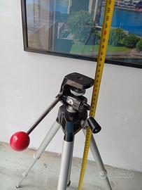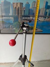 Questo oggetto è un treppiede vintage per macchine fotografiche, identificato come il modello Slik Goodman Handy. È un accessorio fotografico classico degli anni '70, realizzato in Giappone. Ecco alcune delle sue caratteristiche principali: Design compatto: È un treppiede estensibile e leggero, pensato per essere facilmente trasportabile. Materiali: Realizzato prevalentemente in alluminio con gambe a vite per il bloccaggio. Testa a sfera: Presenta una testa caratteristica con una manopola rossa rotonda, utilizzata per regolare l'inquadratura della fotocamera. Altezza: Una volta completamente aperto, può raggiungere un'altezza di circa 120cm, a seconda della versione specific