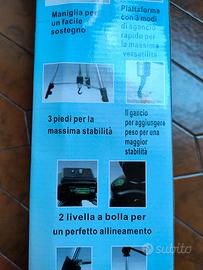 vendo treppiedi mai usato. Scatola originale e custodia. maniglia per il trasporto, gancio per aggiungere peso per una maggiore stabilità, livella a bolla per un perfetto allineamento.