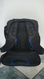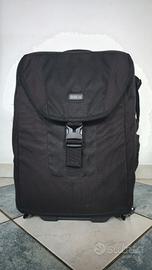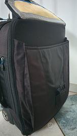 Fenomenale trolley fotografico, indistruttibile, Capiente, Modulabile. All'occorrenza si trasforma in zaino con gli spallacci a scomparsa. Si può portare in aereo, in cabina, come bagaglio a mano. Protegge l'attrezzatura come nessun altro e ha capienti tasche per gli accessori, tasca esterna per Laptop o altra attrezzatura (Ronin, felpe, ecc.). Già impermeabile di suo ma con sacca antipioggia aggiuntiva. Ruote gommate perfette. Maniglia a scomparsa.