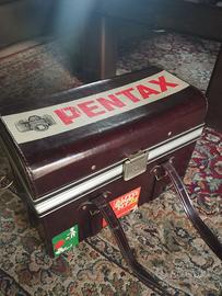 Vendo bellissima valigia fotografica rigida in pelle per fotocamere vintage Asahi Pentax marca Sacar, rivestita in tessuto rosso e con uno scompartimento e una tasca all'interno. Prezzo trattabile