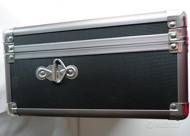 Valigia Quantaray in allumino per fotocamere e obiettivi interno in spugna sagomata co sei spazzi sagomati.la parte superiore protetta con la spugna misure esterne 33x24x13