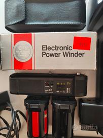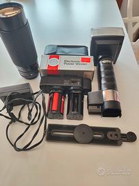 Materiale anni '80. Zoom Panagor 60 300, electonic Power winder per Canon C-1, flash Metz 45 CT-1.