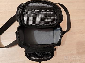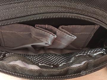 Borsa Canon a tracolla di piccole dimensioni, nera e cachi. Ideale per fotocamera classica, fotocamera reflex, videocamera di piccole dimensioni o simili + il contenere oggettistica di piccole dimensioni. 2 tasche e 2 divisori mobili per creare scompartimenti nella borsa. In generale in buone condizioni, in alcuni punti usurata solo esternamente