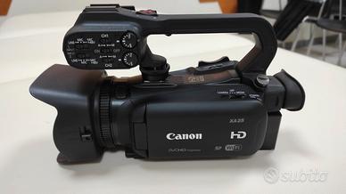 Videocamera professionale Canon XA25 con maniglia per attacco microfoni esterni xlr e doppio slot di registrazione. Ideale per riprese professionali. Come nuova. Esteticamente perfetta senza segni di usare. Usata solo per riprese in interno sempre su cavalletto. Inclusi accessori: alimentatore originale canon, batteria canon, borsa e telecomando ad infrarossi e cavi aggiuntivi omaggio. Non viene fornita la confezione e istruzioni cartacee. Il manuale pdf potete scaricarlo su sito canon. La videocamera viene controllata, sanificata e inviata con pacco imbottito. Seguono principali caratteristiche: Full HD Obiettivo ad alta definizione Obiettivo grandangolare Zoom ottico 20x Riprese stabili in qualsiasi situazione Immagini stabili anche in movimento Video eccellenti anche con poca luce Potenza di elaborazione DIGIC Controllo Wi-Fi e condivisione semplice Diaframma circolare a 8 lamelle Registrazione AVCHD a 28 Mbps Registrazione MP4 a 35 Mbps Audio perfettamente in linea con la scena Audio professionale Touch screen OLED da 8,8 cm Doppio slot per schede SDXC Instant AF ---- Sensore Sensore HD CMOS Pro di tipo 1/2,84 Registrazione AVCHD: PCM lineare¹ (2 canali, 16 bit, 48 kHz) o Dolby Digital (AC-3 a 2 canali, 48 kHz) MP4: MPEG-2 AAC LC (2 canali) Controllo I controlli audio includono: Ingresso a 2 canali indipendente Line/Mic/Mic+48 V; Controllo indipendente dei livelli per canale (da -∞ a +18 dB); Limitatori audio indipendenti (2 canali); AVCHD (bitrate variabile in tutte le modalità, campionamento colore 4:2:0): 1920x1080: 50p (28 Mbps, audio PCM lineare disponibile); 1920x1080: 50i/PF25 (24 Mbps, 17 Mbps); 1440x1080: 50i/PF25 (5 Mbps) MP4 (bitrate variabile in tutte le modalità, campionamento colore 4:2:0): 1920x1080: 50p (35 Mbps); 1920x1080: 25P (24 Mbps, 17 Mbps); 1280x720: 25P (4 Mbps); 640x360: 25P (3 Mbps) -- HDMI USB Uscita HD/SD-SDI Terminale AV Terminale controllo remoto