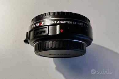 VILTROX EF-M2II 0.71x Speed-booster Adattatore MFT per Obiettivo EF mount a Micro 4/3 Fotocamere GH6 GH5M2 BMPCC 4K GH4 GH5 G100 G95 G85 OM-1 EM-1 Come nuovo nella sua confezione originale, provato e mai usato. Compatibilità: VILTROX EF-M2 II è una versione aggiornata di EF-M2, progettata per gli obiettivi Canon della serie EF da utilizzare su fotocamere con attacco M4/3, come GH4 GH5 GF6 GF1 GX7 GX85 E-M5 E-M10 E-M10II E-PL5 (non per obiettivi con attacco EF-S) Convertitore di riduzione focale 0,71x: la lunghezza focale viene moltiplicata per 0,71 in base all'originale (lunghezza focale equivalente = lunghezza focale x 0,71), che aiuta ad allargare l'apertura di 1 stop Funzioni AF e diaframma regolabile: funzione di messa a fuoco automatica, aumento dell'obiettivo di 1 f-stop e della quantità di luce sullo sfondo virtuale, per evidenziare meglio il tema; regolazione del diaframma direttamente dalla fotocamera per controllare l'apertura effettiva dell'obiettivo Materiale e design: le baionette sono realizzate in metallo con trattamento di placcatura superficiale, per essere durevoli e robuste; contatti elettronici in rame incorporati e funzione IS, che rendono la messa a fuoco precisa e chiara, con piedino per treppiede con filettatura da 1/4" nella parte inferiore, ecc. Aggiornamento firmware USB: dotato di interfaccia USB, può realizzare l'aggiornamento del software. Può perfezionare le nuove funzioni dell'adattatore per il montaggio dell'obiettivo e correggere i bug in base agli aggiornamenti successivi