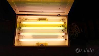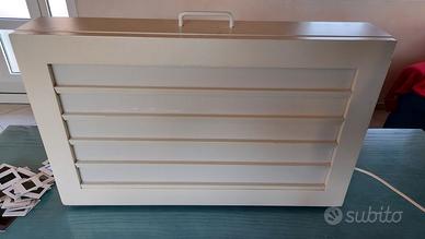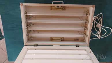 Per inutilizzo vendo Visore illuminato per 55 diapositive contemporaneamente. Il visore è adatto alle scelte delle diapositive, è stato costruito in legno leggero e misura 66 x 41 x 13 con peso di 6 kg all'interno il sistema di illuminazione è dotato di 4 neon e di cavo collegamento a tensione elettrica tramite presa con interuttore di accensione e spegnimento con ganci per avvolgimento cavo. Il sistema di chiusura è a valigia con gancio laterale. Nel prezzo è compreso il trasporto e consegna nel raggio di 30 km
