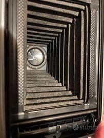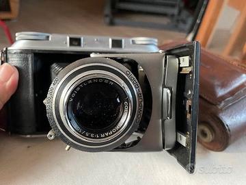Macchina fotografica pieghevole Voigtländer formato 6x9 cm con obiettivo Color-Skopar 105 f3.5 e borsa originale di cuoio.