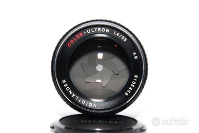 Voigtlander Color Ultron 55mm 1.4 AR Obiettivo con Innesto a baionetta QBM con Tappi Lens Made in Japan Dedicato alle Reflex Voigtländer VSL (VSL-1, VSL-2, VSL-3E) e alle Reflex Rolleiflex SL (SL-35, SL-350, SL-35E, SL-35M) ***In Eccellenti Condizioni e Funzionante*** ***Utilizzabile anche sulle fotocamere digitali CON APPOSITO ADATTATORE*** OGGETTI COMPRESI OBIETTIVO VOIGTLANDER COLOR ULTRON 55mm 1,4 AR TAPPO ANTERIORE ORIGINALE VOIGTLANDER TAPPO POSTERIORE (ADATTATO) STATO DEGLI OGGETTI OBIETTIVO IN ECCELLENTI CONDIZIONI E FUNZIONANTE. SENZA GRAFFI O FUNGHI SULLE LENTI. DIAFRAMMA SCATTANTE E PULITO. GHIERE FLUIDE, SEGNI D’USO ESTERNI ASSENTI. DESCRIZIONE L’obiettivo Voigtländer Color Ultron 55mm. 1.4 AR, è un obiettivo standard nella versione con luminosità 1,4. Si tratta di un'obiettivo di grande qualità costruttiva e ottica. Molto nitido e ottimo per tutte le situazioni fotografiche. Diaframma a 6 lamelle. Ha un'ottima definizione e un eccellente sfocato (bokeh). Schema ottico composto da 7 lenti in 5 gruppi. E' provvisto di innesto a baionetta QBM (QBM II Mount) dotato di pin aggiuntivo per la lettura dell'esposizione a tutta apertura del diaframma nei modelli di reflex con questa possibilità. L’innesto è compatibile con tutte le Fotocamere con Innesto a Baionetta QBM *** VEDI GLI ALTRI ARTICOLI FOTOGRAFICI CHE HO IN VENDITA ***
