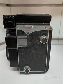 Yashica- E, medio formato (6x6), obiettivo Yashinon 80/3,5. Sistema a esposizione completamente automatica. otturatore a velocità singola (1/60) con apertura impostata automaticamente dall'esposimetro incorporato.