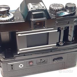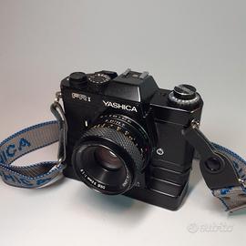 Yashica FR I con obiettivo 50mm DSB 1:1.9 con WINDER YASHICA. Funzionante con pellicola 35mm. Esposimetro e tempi funzionanti. Contatore foto funzionante. Pile nella fotocamera e tracolla comprese. Non testata con pellicola. Le foto sono parte integrante della descrizione.
