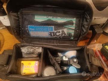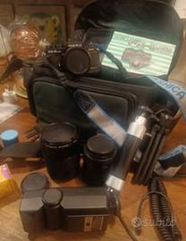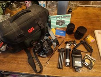 Con obiettivo per macro e prolunga (questa in regalo in quanto segnata sulla parte in ferro ma perfettamente funzionante ) Completa di tutto il necessario, borsa, flash, treppiedi, prolunga per foto a distanza, filtri con manuale originale.