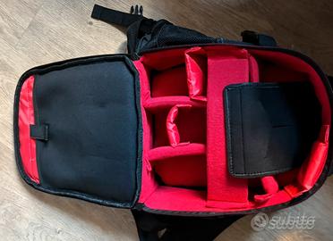 Scomparto imbottito per fotocamera 6 divisori interni rimovibili nello scomparto della fotocamera, 1 divisore in neoprene con chiusura a gancio fisso, spallacci regolabili in lunghezza con imbottitura ergonomica. Cinturino in vita regolabile in lunghezza Impugnatura morbida imbottita Sotto il coperchio è uno scomparto in neoprene per tablet fino a 10, 1 altro scomparto frontale con cerniera in rete e organizer in neoprene. Due tasche laterali in rete per piedi regolabili in misura, sul lato dello zaino Adatto come bagaglio a mano Protezione dagli agenti atmosferici protegge lo zaino da pioggia e polvere.