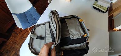 Zaino fotografico Parallax MOUNTAIN SMITH. 2 cerniere posteriori, la prima per oggetti vari con piccola tasca con cerniera, la seconda con 2 scomparti di cui 1 per computer portatile con fermo in velcro, il secondo per oggetti vari con altra taschina con cerniera. Riparata dietro lo schienale la amplia cerniera per zona corpi macchina, obiettivi, Flash e accessori, modulabile con scomparti a velcro molto capiente. Largo cinghiaggio in vita e stretto per tenere uniti i confortevoli spallacci. Lateralmente sono presenti 1 retina e 2 cinghie con fibbie per ogni lato. 2 maniglie per il trasporto a mano dall'alto e sul lato. Sotto è presente una tasca con cerniera che contiene il telo di protezione anti- pioggia. Sotto e sul lato esterno posteriore sono presenti cinghiaggi per il trasporto di cavalletti o altri oggetti vari. Il colore è gerdone con inserti neri e grigi. La condizione è pari al nuovo, la qualità è professionale. Il prezzo non è trattabile, la spedizione è a carico dell'acquirente. Eventuale consegna a mano a Imperia
