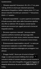 Materiale: Nylon 900D, resistente all'acqua.Colore: Blu.Dimensioni: 30 x 17 x 45 cm.Capacità: Progettato per 1 fotocamera e 2 obiettivi, con scomparti modulari.Caratteristiche: Design roll-top con scomparto dedicato per laptop fino a 15 pollici e tasca frontale con protezione RFID.