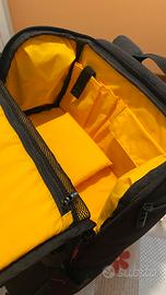 Compresa c’è anche la copertura amtipioggia. È adatto per una DSLR con batteria e un lungo teleobiettivo e 5 - 6 obiettivi, flash e oggetti personali.