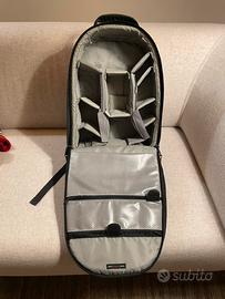 Zaino fotografico molto ampio, con tasca per computer (fino a 16"), tasca esterna profonda, sistema porta cavalletto. Interno completamente personalizzabile: togliendo i divisori è molto comodo anche come bagaglio a mano.