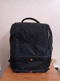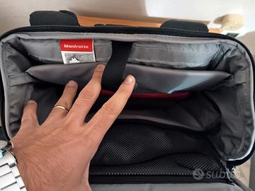 Dalle foto si può notare una struttura compatta ma ben organizzata, tipica degli zaini fotografici Manfrotto.