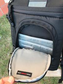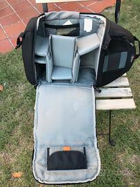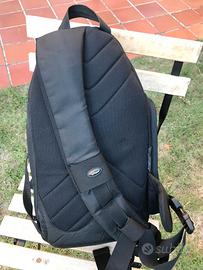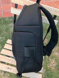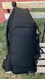 Vendo zaino monospalla usato marca LOWEPRO, modello Slingshot 200 AW (All-Weather, infatti è dotato di una sacca di protezione, nascosta sul fondo ed estraibile, per proteggerlo dalla pioggia in caso di necessità). Colore nero/grigio. Svariate tasche per l’inserimento di schede di memoria, accessori vari, esposimetro, biro, tappi ecc. Compartimento principale inferiore con divisori combinabili a piacere con velcro per macchina foto e obiettivi, patta con panno in microfibra per protezione ed eventuale pulizia dello schermo del corpo macchina, scomparto superiore separato per eventuale lampeggiatore o altro (abbigliamento, cibo, batterie, alimentatori). Possibilità di estrarre la macchina foto senza togliere lo zaino dalla spalla, semplicemente ruotandolo, avendo un solo spallaccio, aprendo la cerniera che permette di accedere alla tasca inferiore-centrale, protetta da due clips a sgancio rapido. Anche lo spallaccio può essere liberato con un grosso gancio, senza far passare lo zaino dalla testa. Ottime condizioni di conservazione e uso. Non spedisco, possibilità di consegna e visione Casale, Biella, Vercelli, bassa valle d’Aosta e zone limitrofe.