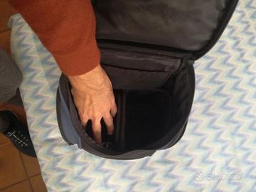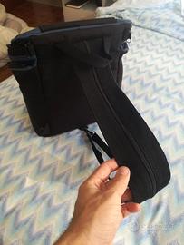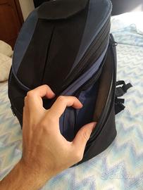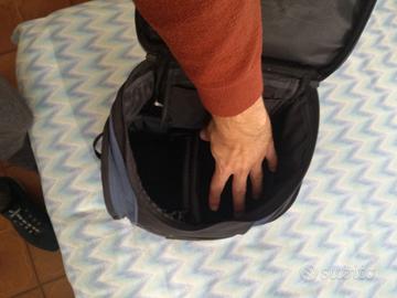 Vendo zaino fotografico piccolo spalla tracolla. Ci sono tante tasche sia esterne che interne. Porta due obiettivi/macchine fotografiche professionali. Quando indossato, arriva a mezza schiena. Le spalline si possono tenere separate come in un normale zaino o unire con una zip per metterle a tracolla. Al fondo ci sono più punti a cui agganciare le spalline con un moschettone. Colore blu e nero. Comodo per portarsi un piccolo corredo senza scomodare lo zaino principale.