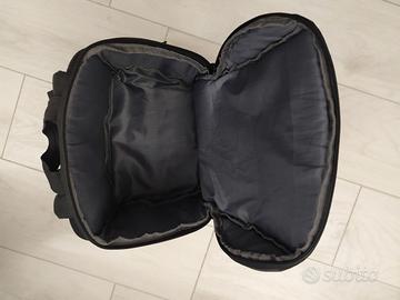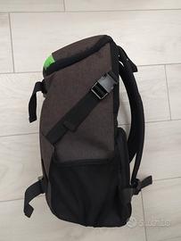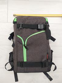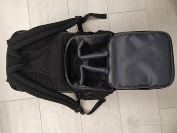 Zaino in perfetto stato, ideale per uscite fotografiche con spazio per una fotocamera e 2 obiettivi piccoli o un obiettivo e batterie di riserva. Vano modulabile e apribile dalla schiena, per evitare furti o aperture accidentali. Vano superiore porta oggetti per la necessità di uscita. Lacci posteriori e laterali per poter portare anche un cavalletto, 2 tasche esterne retate.