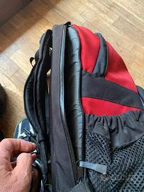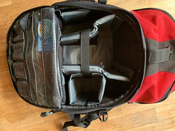Zaino TAMRAC con scomparti per attrezzatura fotografica, tasca per laptop e mascone grande superiore. Buono stato, robusto e leggero, unico difetto la fibbia della cintura addominale, un po' rovinata (come da foto).