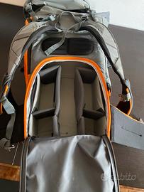 Vendo belissimo zaino LowePro 500 AW usato non piu di 5 volte. Lo zaino è pensato per escursioni e trekking e può ospitare due corpi macchina, 3/4 obiettivie e qualche accessorio. Nello scompartimento superiore è possibile metterci un piumino, un pile, cibo e una bottiglia da 1/2 litri più qualche accessorio come guanti, cappello eccettera.
