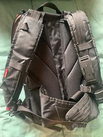 Zaino di medie dimensioni per macchina fotografica e accessori con cappello rigido e telo anti pioggia. Come da foto allegate un anellino di plastica è rotto, ma tutte le cerniere funzionano perfettamente..