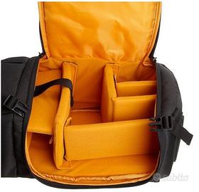 Lo zaino AmazonBasics per fotocamere SLR presenta una parte interna ben imbottita per proteggere al meglio fotocamera e accessori. Grazie allo spallaccio singolo raggiungere la fotocamera e i vari accessori è semplice, poiché basta far scorrere lo zaino per portarlo dalla schiena al petto.
