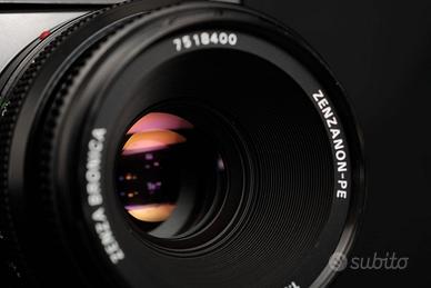 Zenzanon 75mm f/2.8 PE, ultima e migliore versione della serie: una resa sorprendente, che nella mia esperienza diretta non sfigura rispetto allo Zeiss Planar 80mm per Hasselblad. Lenti immacolate, barilotto come nuovo, ghiere morbide e precise.