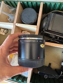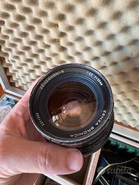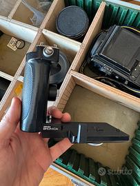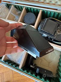 Macchina fotografica medio formato Zenza Bronica SQ con obiettivo Zenzanon 50mm f3.5, maniglia di scatto, duplicatore di focale, mirino a pozzetto e mirino classico. Segni solamente estetici sulla scocca. Revisionata nel 2025.