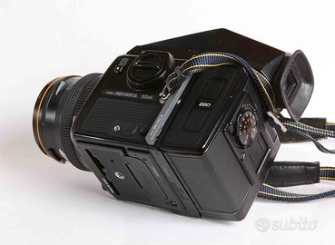 FOTOCAMERA GIAPPONESE DEL 1983. PARLIAMO DI UN FORMATO 120 CHE FA NEGATIVI DI FORMATO 6X6 CIRCA. L'APPARECCHIO CHE PUO' SCATTARE SOLO SE ALL'INTERNO VI E' IL RULLO E' STATO TESTATO CON UN DUMMY ROLL FILM CHE MI HA PERMESSO DI CONSTATARNE LA FUNZIONALITA'. L'OTTICA E' IN OTTIMO STATO PRIVA DI FUNGHI FOSCHIA O ALTRO SOLO PUNTI DI POLVERE, LE LAMELLE DEL DIAFRAMMA SONO PULITE ED I TEMPI RISPONDONO ALLA PERFEZIONE FINO A 16 SECONDI. L'OTTURATORE E' ELETTRONICO ED E' AZIONATO DA 4 BATTERIE LR44. IL MAGAZZINO IN DOTAZIONE E' UN 220 CHE PERMETTE DI MONTARE ANCHE IL RULLO 120 MA CONSIDERATE DI BRUCIARE CIRCA I 2 O 3 FOTOGRAMMI INIZIALI. TESTATA ANCHE CON RULLO 120. PENTAPRISMA NON ESPOSIMETRICO. IN DOTAZIONE LA SUA TRACOLLA ORIGINALE. ATTENZIONE NON SPEDISCO. VENDITA ESCLUSIVAMENTE DI PERSONA.